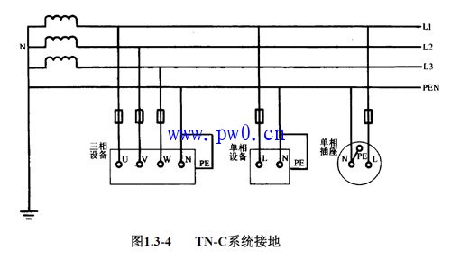TN-C系统如图1.3-4所示,它将PE线和N线的功能综合起来,由一根称为保护中性线PEN,同时承担保护和中性线两者的功能。在用电设备处,PEN线既连接到负荷中性点上,又连接到设备外壳等可导电部分。此时注意火线 (L)与零线(N)要接对,否则外壳要带电。TN-C现在已很少采用,尤其是在民用配电中已基本上不允许采用TN—C系统。