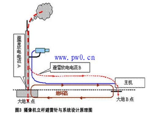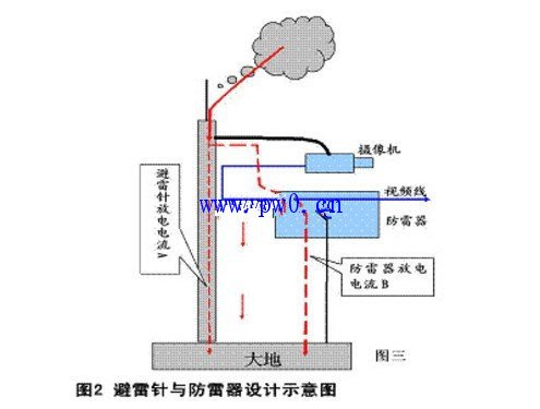 这里应该注意到摄像机立杆接闪时,视频信号防雷器放电通道是:“避雷针体—摄像机—视频短线—防雷器内部放电元件短路—接地点—接地网”;接闪时,避雷针体与防雷器这两个“雷电流放电通道”是并联向地网放电的。