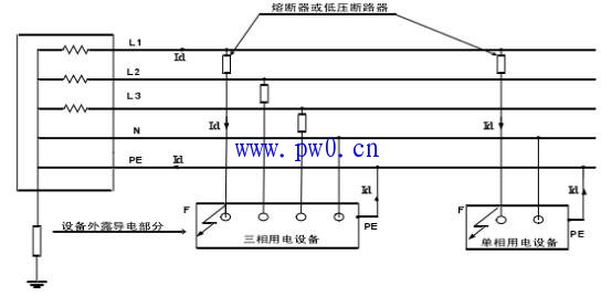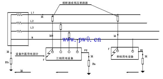 如图4所示。与TN系统不同的是,用电设备的外露可导电部分通过各自的PE线接地实现接地故障保护。
