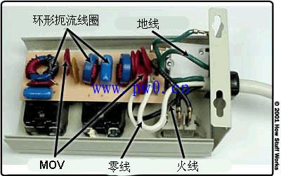 有些浪涌保护器具有线路调节系统,用于滤除“线路噪声”,减小电流波动。这种基本浪涌保护器的系统结构非常简单。火线通过环形扼流线圈接到电源板插座上。扼流线圈只是一个用磁性材料做成的环,外面缠绕着导线——基本的电磁铁。火线中所流经电流的上下波动会给电磁铁充电,使其发出电磁能量,从而消除电流的微小波动。这种“经过调节”的电流更加稳定,可使计算机(或其他电子设备)的供电电流更加平缓。