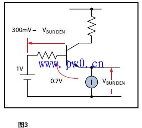 图3 说明了在测量晶体管的发射极电流时由高输入端压降造成的问题。虽然基本被测电流可以用DMM很好的测出,但DMM的输入端压降显著地减小了加在 DUT上的电压,造成了发射极上的电流小 于所要测的。如果用一个皮安表或静电计代替,输入端压降所造成的发射极电流的改变就很微小了。