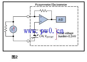 反馈式电流表比分流式电流表更接 近“理想”表,并且用于测量微安(10-6A)或更小电流尤其在严格要求电流表具有低输入阻抗时。与分流式电流表不同,反馈式电流表在一个高增益运放的反馈回路上产生一个电压(如图2),此电压依然与被测电流成比例;但是,在仪器的输入 端观测不到这个电压,而是在运放的输出 端。输入电压等于输出电压除以运放的增益(典型值为 100,000),所以输入端 压降就比毫伏显著减小。反馈电流表的结构具有更小的输入端压降,所以它能在测量小电流时和由低阻器件产生的电流时减小误差。 Keithley 的静电计和皮安表都运用反馈电流表的技术。