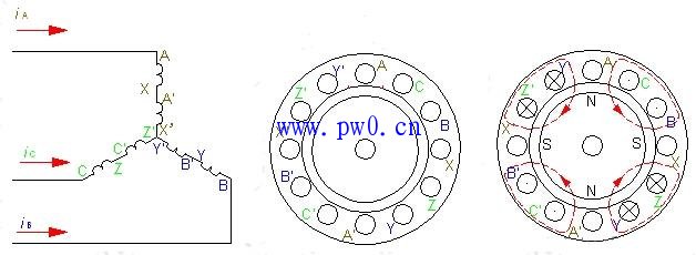 当三相定子绕组按图示排列时,产生一对磁极的旋转磁场,即:P=1。如图1所示。