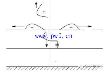 雷击线路杆塔顶部时,由于塔顶电位与导线电位相差很大,可能引起绝缘子串的闪络,即发生反击。雷击杆塔顶部瞬间,负电荷运动产生的雷电流一部分沿杆塔向下传播,还有一部分沿地线向两侧传播,如下图所示。负极性雷电流一部分沿杆塔向下传播,还有一部分沿地线向两侧传播;同时,自塔顶有一正极性雷电流沿主放电通道向上运动,其数值等于三个负雷电流数值之和。线路绝缘上的过电压即由这几个电流波引起。
