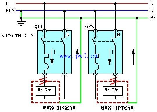 第二:当用电负荷的外露导电部分发生单相接地故障时,故障电流的方向是:断路器N线回路→用电负荷的外露导电部分→PE线,我们看到,这条路径完全没有线路保护能力。