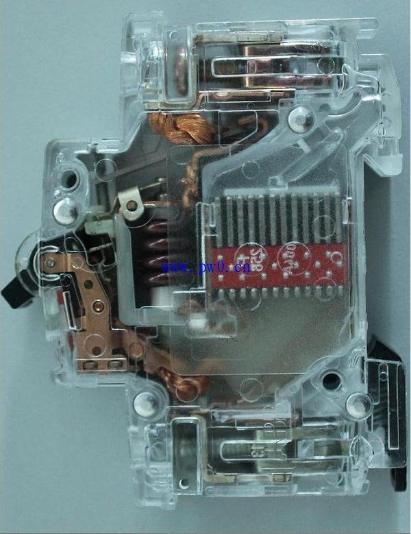 这是一只微型断路器。它的上侧是进线端,下侧是出线端。我们从图中可以看出,出线端的机械复杂程度超过进线端。