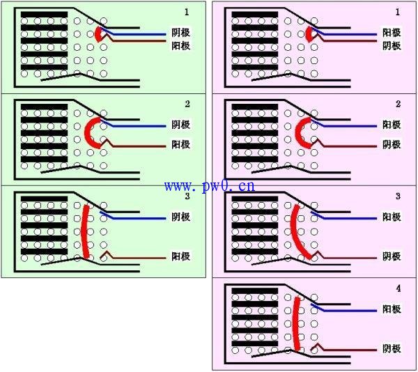 当断路器因为线路短路而跳闸瞬间,这时的电路是有极性的。图中上部是静触头,下部是动触头。图中左侧(绿色部分)表示静触头为负极或者阴极,右侧(红色部分)表示静触头为正极或者阳极。我们来看其中的电弧运动。