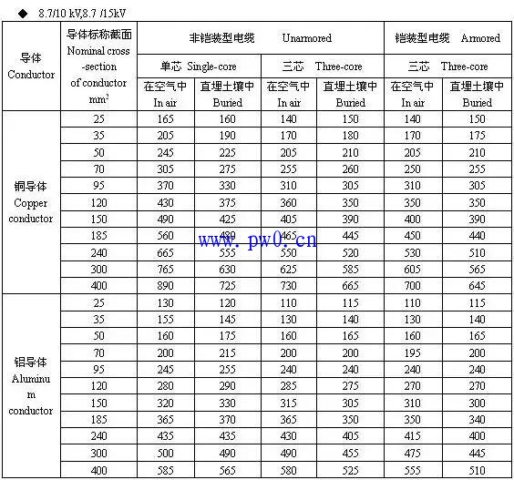 五、10kV铜芯、铝芯电缆载流量查询表