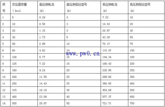 八、电力变压器高、低压熔丝配置查询表