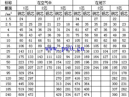 七、常用低压电缆载流量查询表