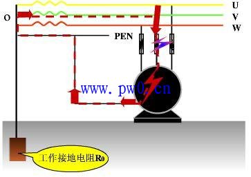 存在的问题:若PEN某一点P处断开,在P点以后的设备外壳上,由于负载中性点的偏移,可能出现危险电压。更为严重的是,若P点以后的某一设备发生“碰壳”故障,即使线路上安装有断路器或熔断器也不会动作,导致后面的设备外壳上长期带有相电压,非常危险。