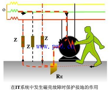 在IT系统中,当电气设备的绝缘损坏使外壳带电且人体触及外壳时,电流同时从接地体和人体流过。由于人体的电阻要比接地电阻Re大很多,流经人体的电流也就比流过接地体的电流小很多,此时电气设备接地保护发生作用,保护人身安全。