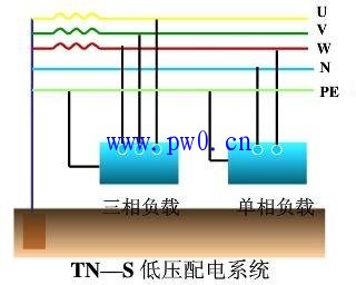 TN-S系统的零线N和保护线PE是分开设置的,所有设备的外壳只和公共的PE线连接。