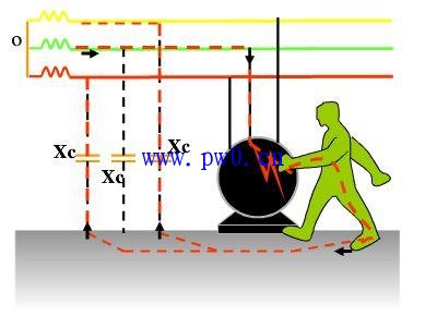 若电气设备发生故障,外壳带相电时,人体触及设备外壳,电流流过人体的路径为:设备外壳->人体->其他两相线路对地分布电容->其他两相电源。此时流过人体的电流大小为:
