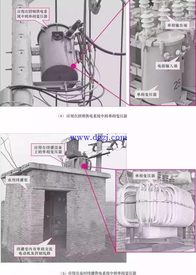 单相变压器多用于农村输配电系统中,以及一些照明或小型电动机的供电中,其应用实例如图1-4所示。此外在很多电子电气设备中,它也可作为电源变压器使用。