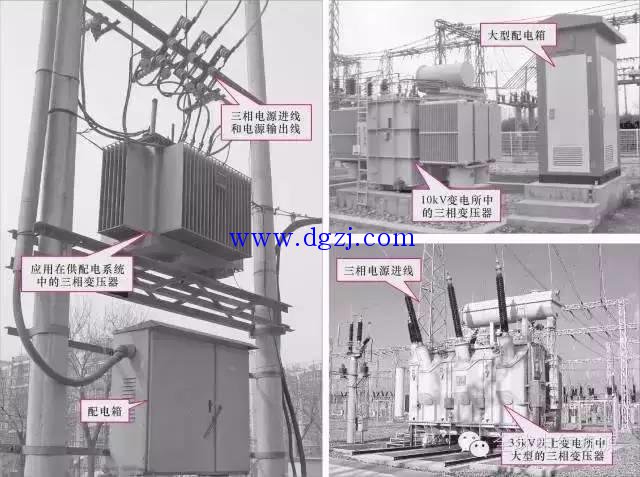 三相变压器的应用范围比较广泛,例如变电站、工矿企业、建筑工地、排灌设备、邮电、纺织、铁路、学校、医院、国防、电梯等,同时也适用于一些电源电压低、波动较大的低压配电线路中。其应用实例如图1-7所示。