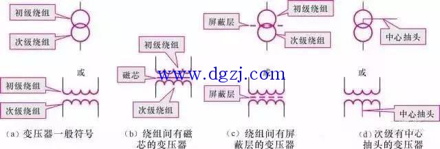 变压器的一般图形符号有两种,分别用于配电线路和电气线路中,其中电压输入端为变压器的初级绕组,电压输出端为变压器的次级绕组。此外带有磁芯或中心抽头的变压器,在其图形符号中也有所表示,如图1-13所示。