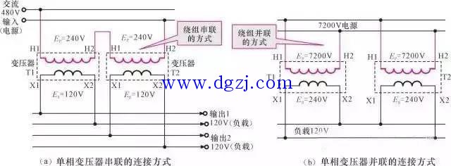 在实际的线路中,单相变压器的连接方式有两种,分别为串联方式和并联方式,如图1-16所示。变压器经串联可以得到较大的额定电压,而并联可以得到较大的额定电流。