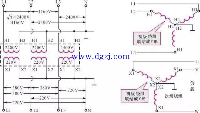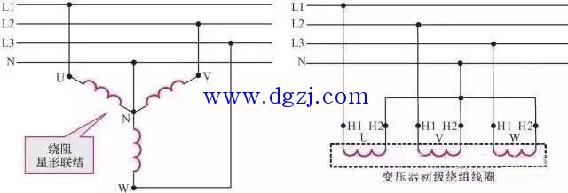 三相变压器在线路中最常用的就是Y-Y形联结,即初级绕组和次级绕组均用Y形的联结方式,如图1-18所示。