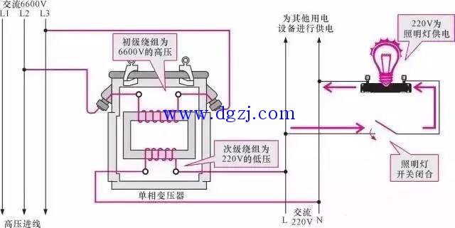 单相变压器可将高压供电变成单相低压,供各种设备使用,例如可将交流6600V高压经单相变压器变为交流220V低压,为照明灯或其他设备供电,如图1-3所示。单相变压器有结构简单、体积小、损耗低等优点,适宜在负荷较小的低压配电线路(60Hz以下)中使用。