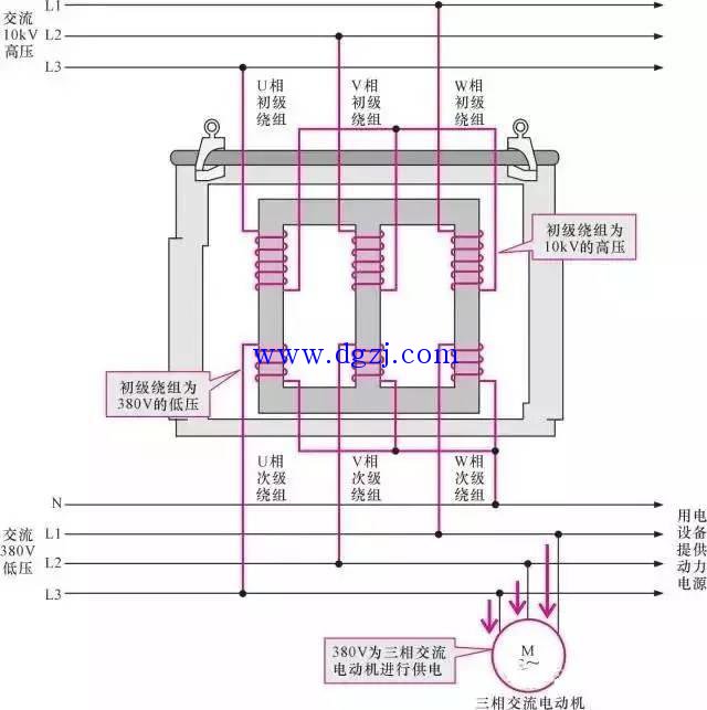 三相变压器主要用于三相供电系统中的升压或降压,比较常用的就是将几千伏的高压变为380V的低压,为用电设备提供动力电源,如图1-6所示。