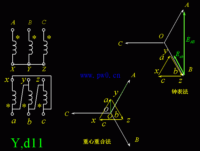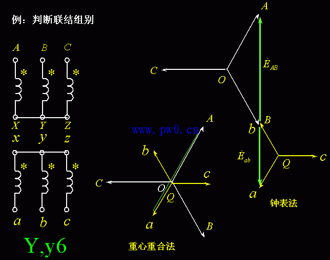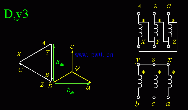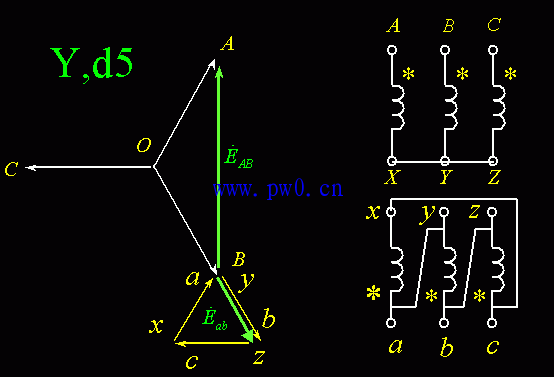 如果一次侧为Y接法,AB相线电势EAB的相位为0度,二次侧也为Y接法,对应的ab相的线电势Eab之相位为0度,则该联结组记为Y,y0。