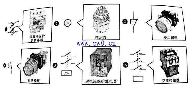 带漏电保护功能的总断路器:用字母“QF”标识,在线路中作为总电源控制开关,同时具有漏电,触电,过载,短路故障时自动断开的功能。指示灯:用字母“HL”标识,在线路中用于指示当前线路的运行状态及是否缺相。停上按钮(不闭锁的常闭按知):用字母“SB”标识,用于低压配电线路的切断控制。启动按钮(不闭锁的常开按钮):用字母“SB”标识,用于低压配电线路的接通控制。过电流保护继电器:用字母“kA”标识,该继电器具有当线圈中的电流高于允许值时触点自动动作的功能,可在过电流时自动切断线路,保护用电设备。交流接触器:用字母“KM”标识,通过线圈的得电,触点动作,接通低压配电线路中用电没备的三相电源,启动低在用电设备工作。