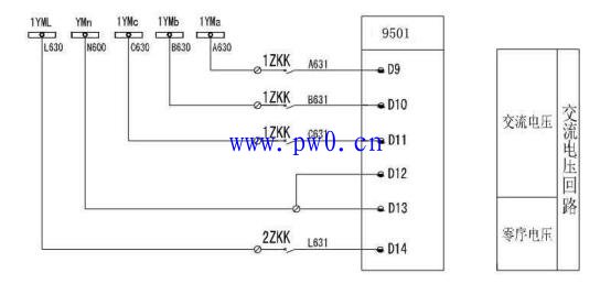 从上图可以看出需要接入的PT模拟量为A、B、C、相电压。当然如果有需要可以接入零序电压进行零序电压保护。由图可以看出此接法为星形/星形接法。如果是V/v接法把D9和D12短接既可。