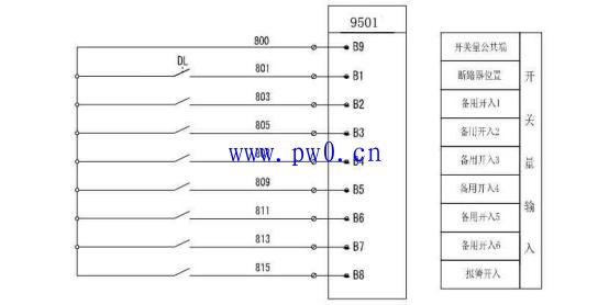 以上为装置的遥信(开关量)回路。与110kV电压等级设备的保护装置不同,35/10kV设备的保护、测控是一体化设计,即整合在一个装置中。除去断路器位置。其它的开入量均可能自行定义。同时还提供一路报警开入信号。可以实现非电量跳闸的信号开入。
