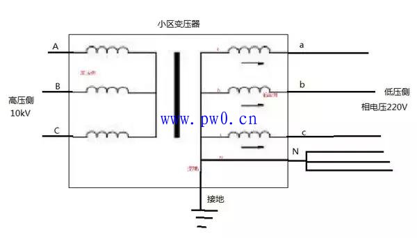 一般高压侧的电压为10kV,那么,经过变压器降压之后,得到的就是220V的abc三相低压电