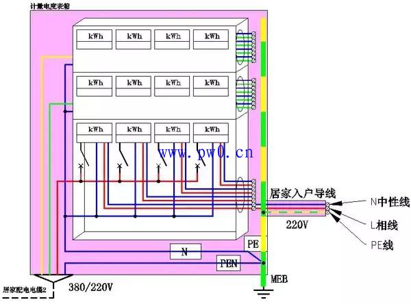 我们看到,N线被引到电度表中,最后与相线和PE线一起,被送往各个居家的入户处。见图中的右下方。