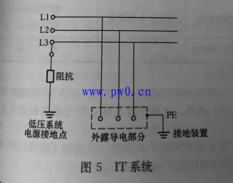 IT系统:带电部分与大地之间不直接连接(经阻抗接地或者不接地),而电气装置的外露导线部分则是接地的。