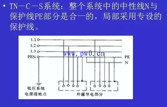 我们看到,当PEN线分开为N线和PE线后,系统共有5根线,这也是国内把TN-S和TN-C-S的-S部分称呼为三相五线制的原因。