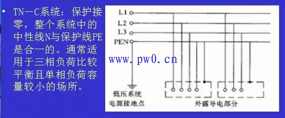 第二:我们看到了系统的接地方式,包括系统接地和保护接地,并且明确了TN-C接地系统的意义和TN-C-S接地系统的意义;