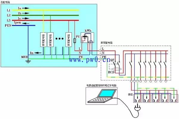 我们看到,从居家配电电缆2引出的PEN零线,被送到上图的右侧,与接地扁钢MEB相连接,然后分开为N线和PE线。N线的名称是中性线,而PE线的名称是保护线。从此以后,零线已经不存在了,只有N线和PE线。
