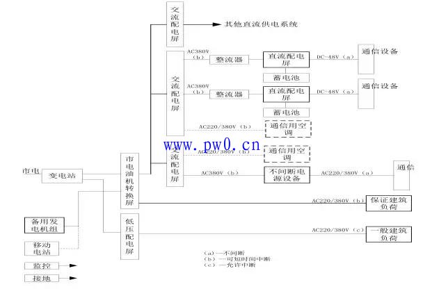 通信电源系统由高低压配电系统、变压器、低压配电、油机发电机组、整流器、交、直流配电屏、UPS电源、蓄电池组、变换器和通信设备配电屏组成。