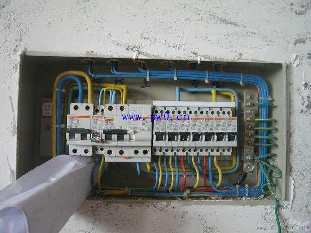 3、不同相之间零线不得共用,如由A相配出的第一根黄色导线连接了二个16A的照明开空,那么A相所配空开零线也只能配这两个空开,配完后直接边接到零线接线端子上。