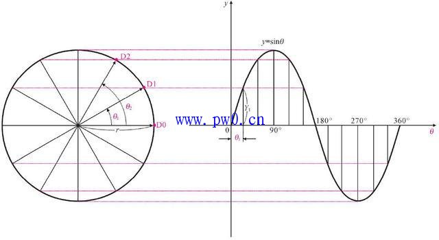 正弦波的解析图如图2-2所示。如果圆周上的一点D 由D0开始以恒定角速度旋转,在任意时刻,如D0、D1、D2……在y轴上的坐标(或在y轴上的分量)可以用正弦函数的公式sinθ来表示,设圆的半径为r,相位角为θ,当D 绕圆心旋转一周时,y的值与旋转角度的关系就是一个正弦曲线。