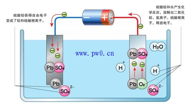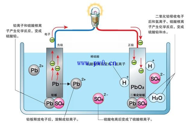 放电的时候,负极的铅溶解出铅离子(Pb2+),只剩下自由电子留在负极。自由电子通过回路,在正极和二氧化铅、氢离子、硫酸根离子产生化学反应,变成硫酸铅和水。在负极,铅离子和硫酸根离子产生化学反应,变成了硫酸铅。