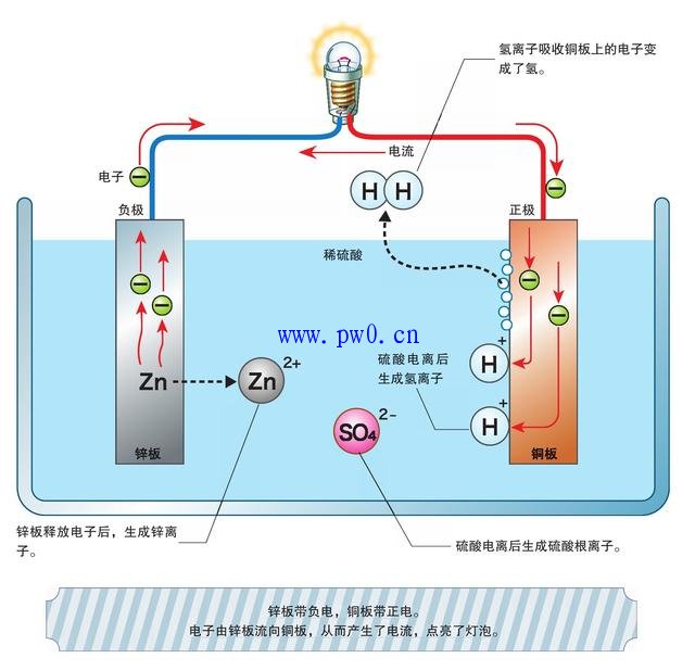 硫酸(H2SO4)放到水里后,电离为氢离子(H+)和硫酸根离子(SO2-4),从而变成了电解液。锌板上的锌(Zn)释放电子溶到电解液里,变成了锌离子。留在锌板上的电子通过导线流向铜板。这样,由于电子的流动,电灯泡有电流通过而发亮。