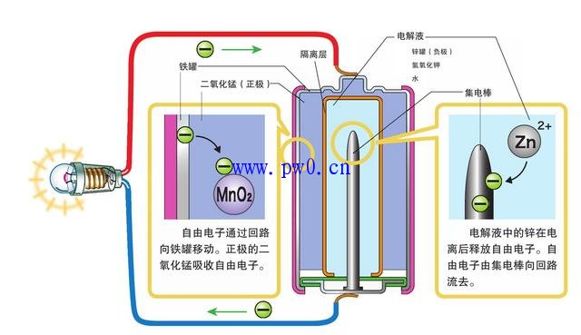在铁罐里面以二氧化锰为正极的电池就是碱性电池。二氧化锰的内侧有隔离层,隔离层内有由锌、氢氧化钾和水组成的电解液为负极,集电棒位在电解液的中央。由于氢氧化钾显碱性,正确来讲碱性电池应该叫做碱性锰电池。碱性电池里面电子的流动如下图所示。