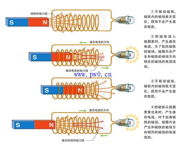在磁场里转动导线可以产生感应电流,往导线卷成的线圈里面拿出或者放入磁铁也可以产生感应电流。磁铁移动的速度越快,感应电流越强。而且,磁铁的磁力越强,线圈的圈数越多,感应电流就越强。