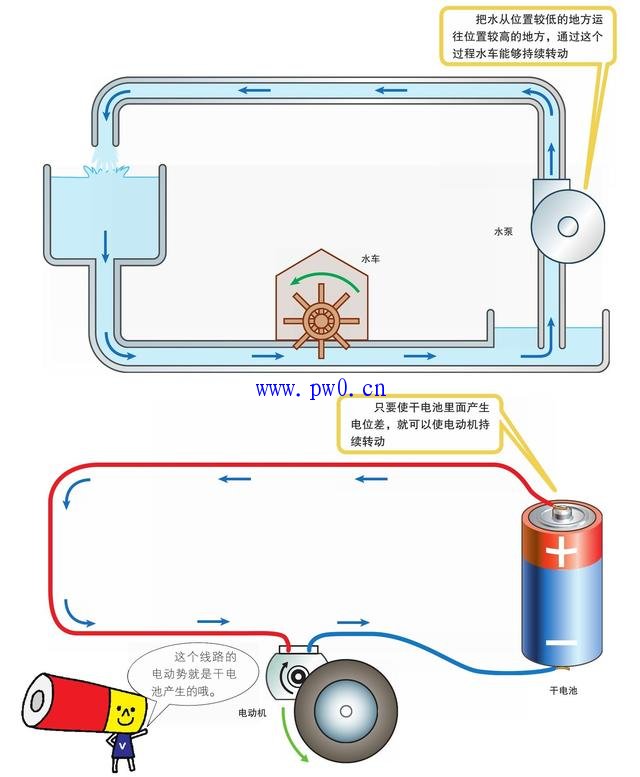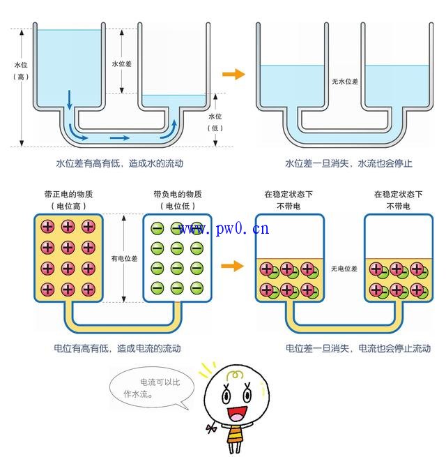 水流和电流的流动方式相似。电流是从电位高的地方流向电位低的地方。