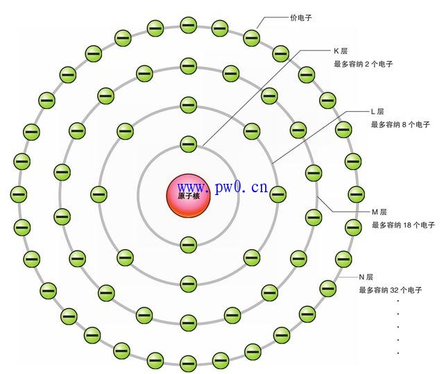 从离原子核最近的位置开始,轨道顺序依次是K层、L层、M层、N层,在每层轨道里,依次有2个(K层)、8个(L层)、18个(M层)、32个(N层)电子。