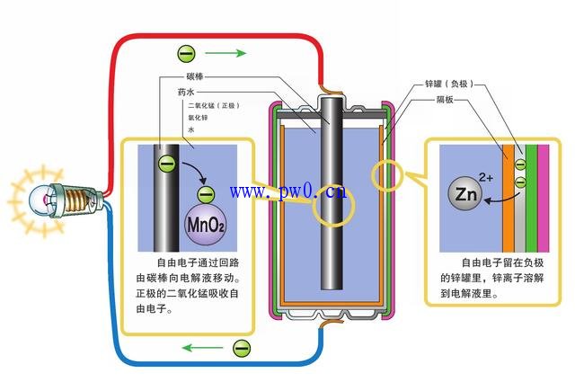 使用碳锌电池的时候,首先锌的自由电子留在锌罐里,锌变成锌离子溶解到电解液里。锌的自由电子通过回路流向碳棒,之后,二氧化锰吸收这些自由电子。由此产生了电子的流动。