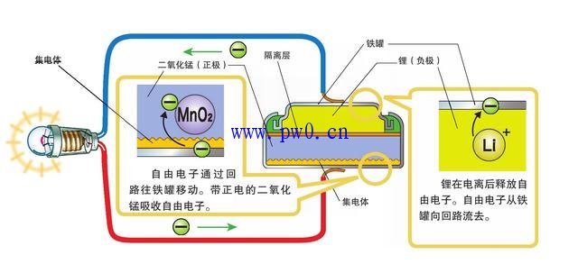 锂电池中的正极大多使用二氧化锰。以分隔装置为界,正极和负极分别放置着二氧化锰和锂。锂电池里面电子的流动如下图所示。
