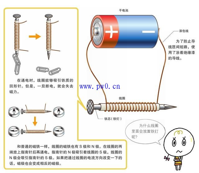 以螺线形方式卷绕的导线称为线圈。给线圈通电,在电流通过的时候,线圈拥有和磁铁一样的磁性。试着拿铁质的回形针靠近线圈,回形针会被线圈吸引。