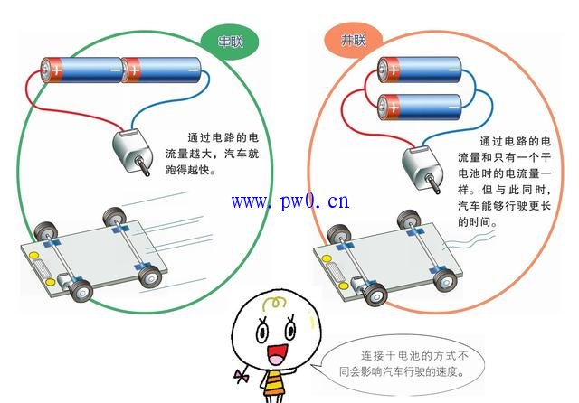 为了加大电流,试着把干电池增加到两个。将两个干电池的正极和负极首尾相连,然后再连接到电动机上时,汽车就会跑得更快。但是,若将两个正极和正极并列相连,负极和负极并列相连的干电池连接到电动机上,则不能加快速度。