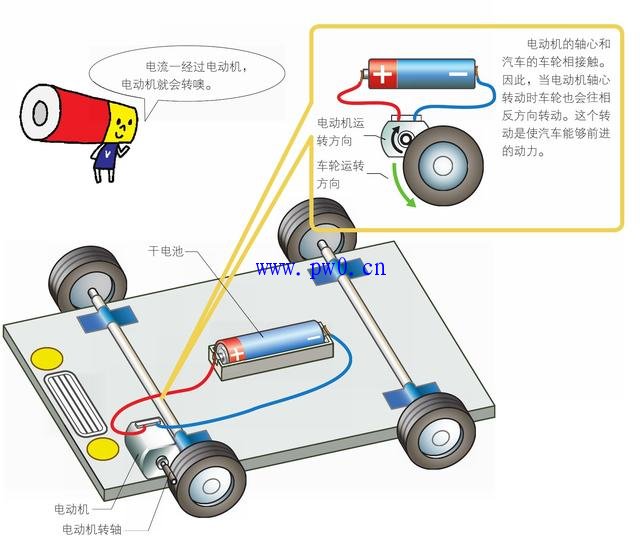 使用电动机可以驱动玩具小车。电动机是能够将电能转换为动能的装置。电是从干电池的正极出发,经过电动机流向干电池的负极。电通过电动机的时候,电能在电动机里转换成动能,转动电动机的轴心。由此,电的流动被称为“电流”。