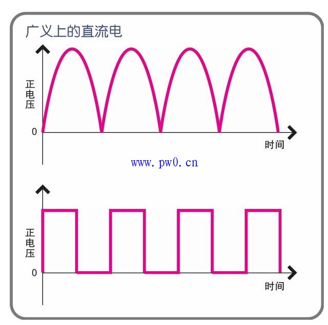 在图表中,用纵轴表示电压,横轴表示时间的话,可以看得出来直流电是一条直线。用整流电路把交流电变换成脉动电流的话,电压虽然有所变化,但是由于电的流动方向是固定的,从广义上来讲就变成了直流电。